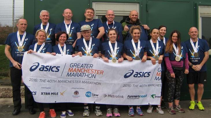 Pictured above: Tim standing proud with his finisher’s medal surrounded by his wife Margaret (in green) and friends at the finish line of the Greater Manchester Marathon 2016.